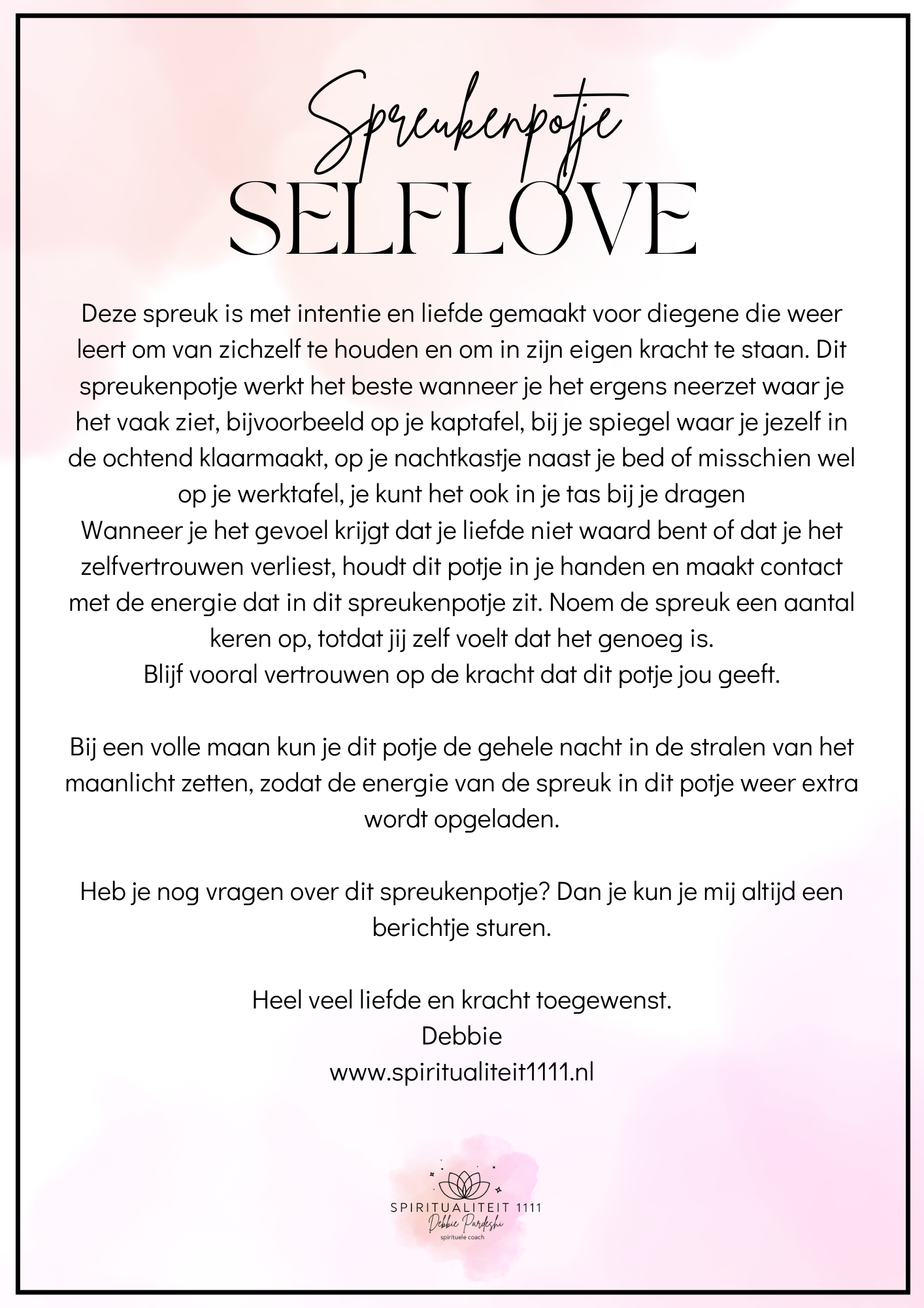 De spreukenpotjes zijn uitsluitend bestemd voor energetische en spirituele werking. Het is niet de bedoeling om magische producten te vervangen voor eventuele medicatie of medische behandelingen. Raadpleeg daarvoor altijd jou eigen huisarts.